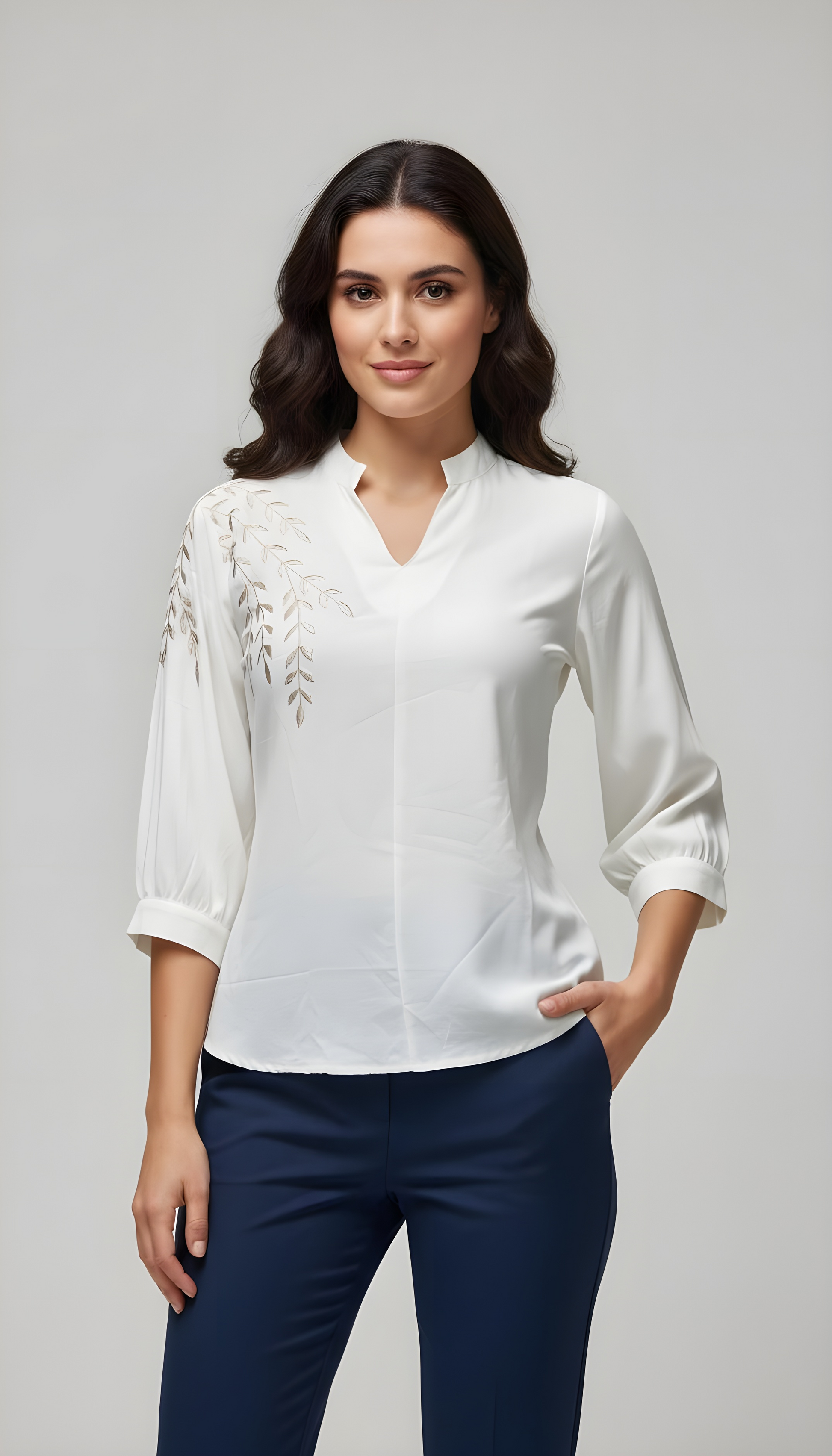 The Leaves Top is a soft, elegant featuring subtle leaf embroidery on the shoulder for a refined, feminine touch. Designed with a modern V-notch neckline and 3/4 sleeves, it offers a clean and polished look that works perfectly for both office wear and everyday style. The smooth, flowy fabric drapes beautifully, giving a light and comfortable feel throughout the day.