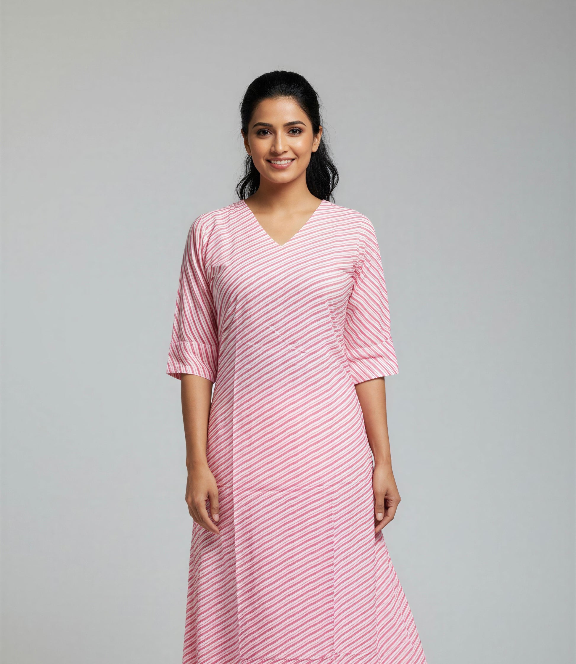 A breezy A-line kurti designed for everyday comfort with a modern touch. The diagonal stripe pattern gives a slimming and stylish look, while the V-neck and 3/4th sleeves add elegance and ease of movement. Made from soft breathable fabric, it is perfect for daily wear, office or casual outings with a fresh and youthful vibe.