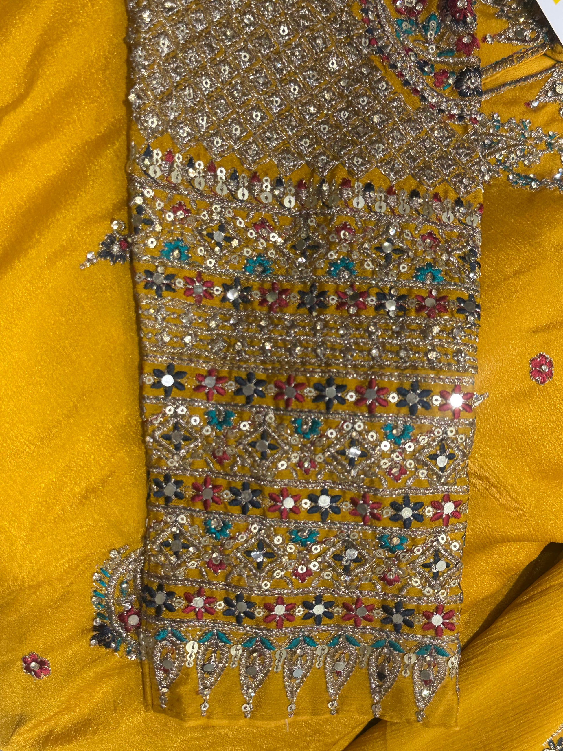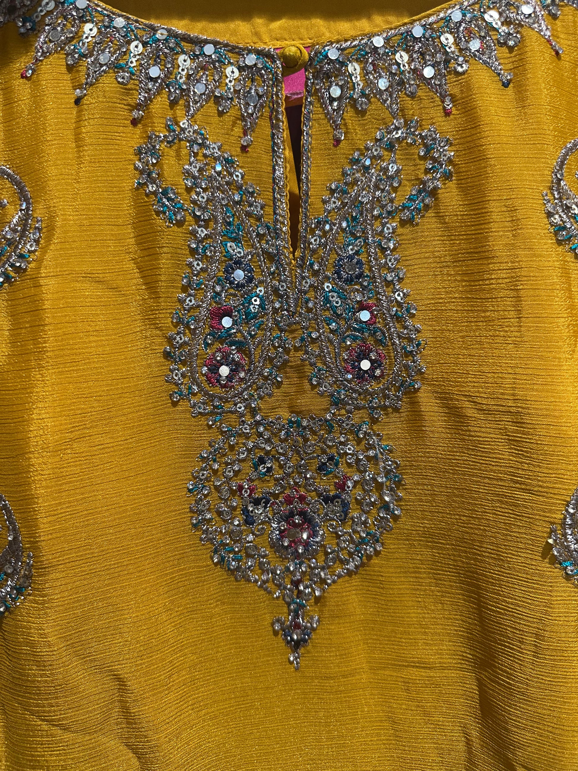 This vibrant mustard yellow handworked suit exudes elegance and tradition. The short kurta is richly embellished with intricate zari, thread, and mirror embroidery, creating a regal and festive look. Paired with a heavily detailed sharara featuring ornate motifs and delicate gota lace, the ensemble radiates luxury. The matching dupatta with embroidered borders completes the outfit beautifully, making it perfect for weddings, festive occasions, or grand celebrations.