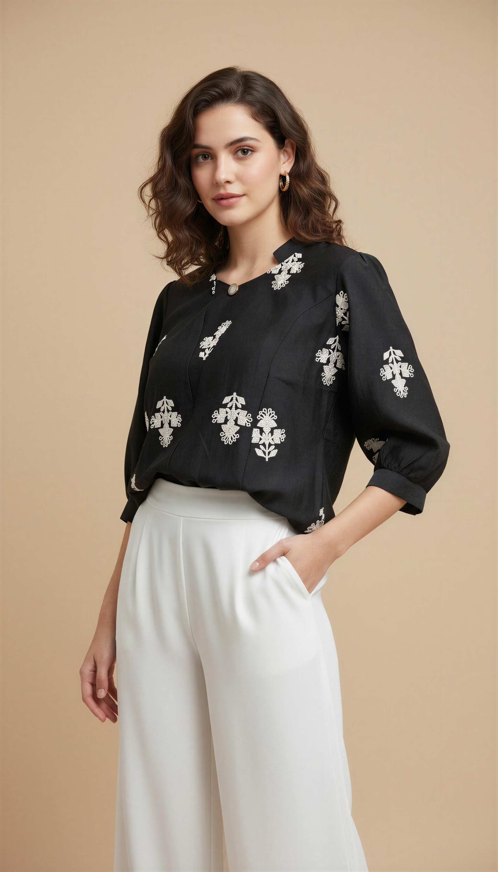 Elevate your everyday style with this elegant embroidered top featuring soft pleats and a modern relaxed silhouette. The intricate thread work on the front and sleeves adds a graceful touch, while the airy 3/4th sleeves and lightweight fabric ensure effortless comfort through the day. A perfect blend of simplicity and sophistication — ideal for both casual outings and chic office looks.