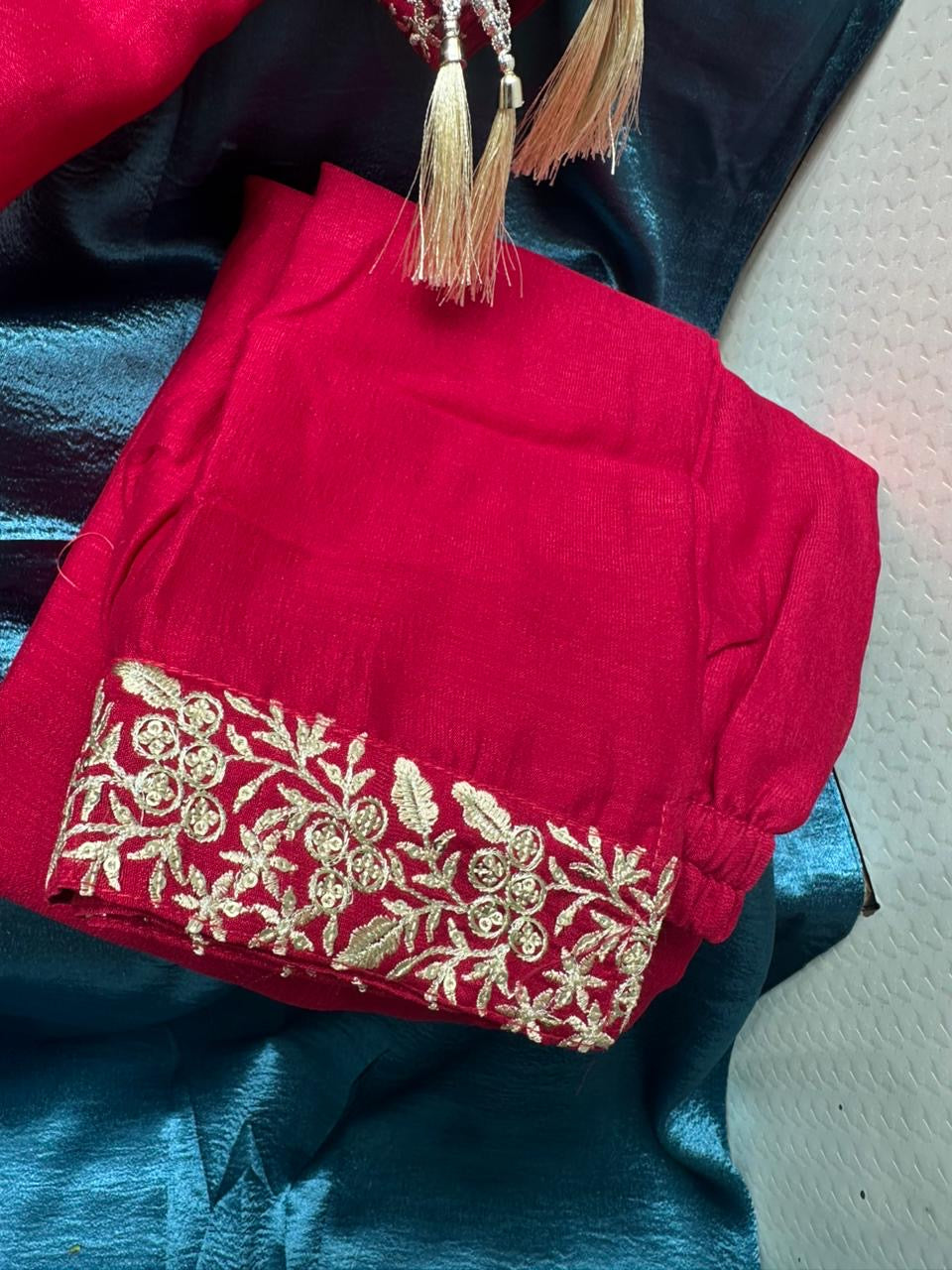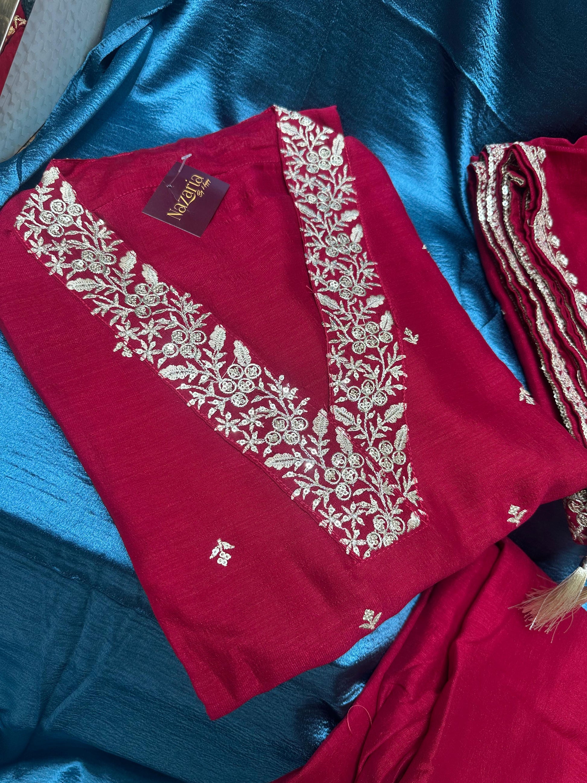 Step into timeless sophistication with our Zaari Straight-Cut Suit, designed in luxurious Red (also available in Rani pink). Adorned with fine embroidery and intricate detailing, this ensemble is an ode to classic Indian elegance—perfect for festive and special occasions.